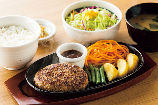 ふっくらと焼き上げるハンバーグは、箸を入れるとジューシーな肉汁があふれ出します。
