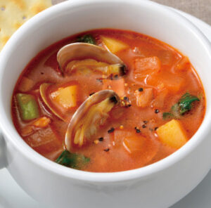 白いクリームタイプのクラムチャウダーとは対照的な赤いトマトベースのマンハッタンクラムチャウダーです。ふっくらとしたあさりとベーコンの旨みが、たっぷりの野菜とスープに溶け込みトマトの酸味ととても合います。具沢山のスープは、パンに添えて朝食やランチにもぜひどうぞ。