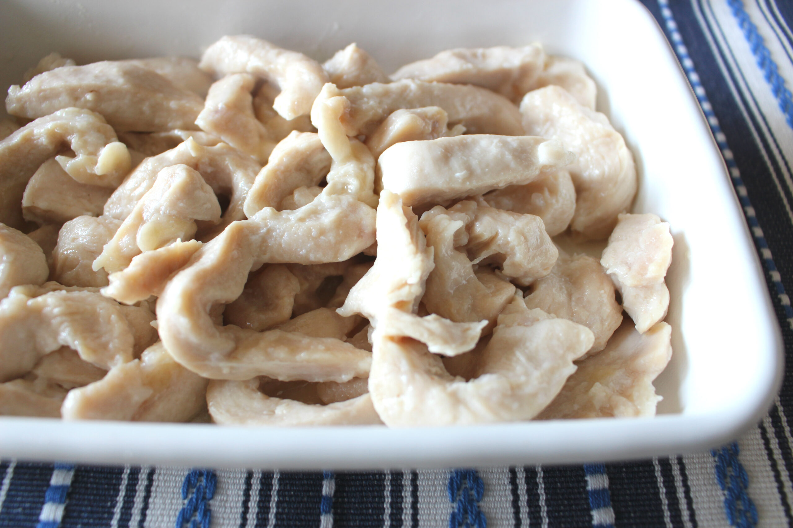 1. 鶏むね肉を2cm幅にスライスし耐熱容器に入れ、レンジで600Wで2分加熱。