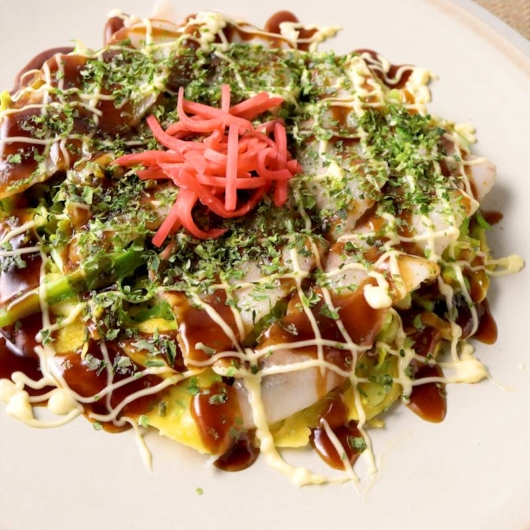6.お好み焼きソース、マヨネーズ、青のり、紅生姜をかけて完成です。