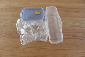 ■ハンバーグ下準備 横長型の耐熱容器とポリ袋使用