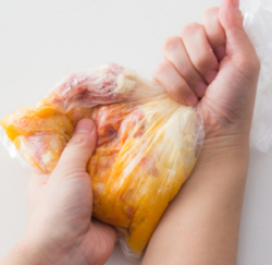 4.ポリ袋に、混ぜた肉ダネを入れて、よく捏ねます。