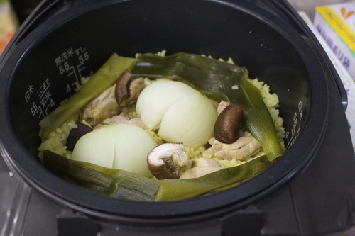 3.臭みとりのため、長ネギの青い部分を入れ、通常通り炊飯する。
