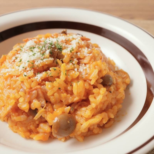 電子レンジでチン!あっという間にできる、リゾット風のトマトごはんです。生クリームなしでも濃厚で本格的な味です。コンソメを使って手軽に味付け出来ます。 トマトジュースを使うことでコクが出ます。 忙しくて時間がない時にも、体にやさしい手作りメニューを! 日々の食事のレパートリーに加えたい、楽チンレシピです。
