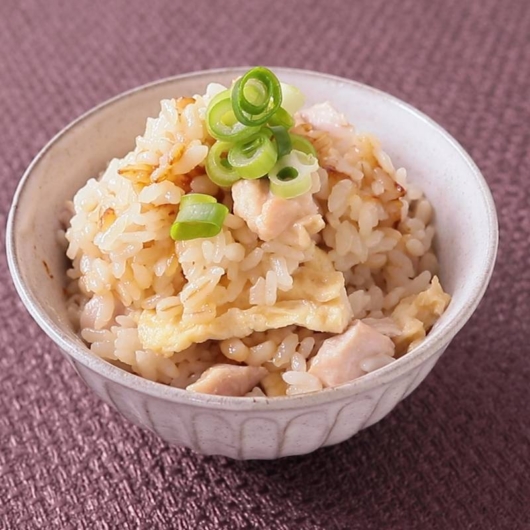 - 鶏肉、昆布、昆布ダシ、長ネギ、酒、コンソメを加え通常通りに炊飯。