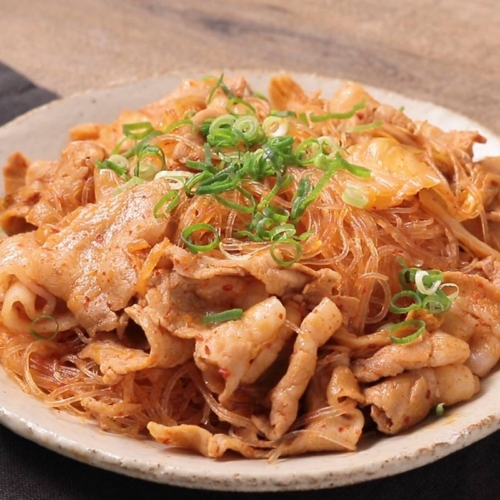 ごはんによく合うおかずの定番豚キムチに、春雨を加えてカサ増しした、春雨豚キムチのご紹介です。つるつる食べられる、旨味を吸った春雨が加わって、いつもとはまた違うおいしさになります。焼肉のタレが甘めなのでコチュジャンとキムチでピリっと辛味をプラスしました。ぜひお試しください。