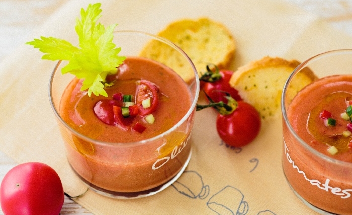 ガスパチョ(英語表記)gazpacho:スペイン料理の一つで、冷製の野菜スープ。トマトを主にたまねぎ・きゅうり・ピーマンなどの野菜とパン・オリーブオイル・ワインビネガー・調味料や香辛料などをミキサーにかけ、とろりとさせたもの。水で濃度を調整し、よく冷やして食べる。タバスコを加えることもある。「ガスパッチョ」ともいう。