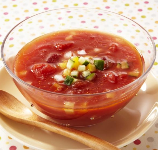 野菜たっぷりで、見た目もキレイな夏の冷製トマトスープ「ガスパチョ風」です。きりっと冷やしておいたカットトマトのパックを開けて、合わせ調味料を加えて混ぜるだけで、簡単に出来る爽やかな冷製スープです。火を使わずにパパッとできるトマトの冷たいスープ!ぜひお試しくださいね。