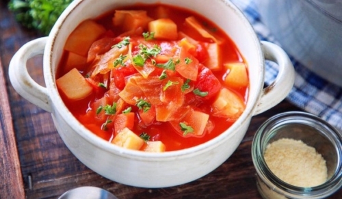 冷蔵庫の余った野菜で出来る、具だくさんのミネストローネ風のスープです。野菜を多く入れているので、野菜のうまみたっぷりのトマトスープです。食べ過ぎた次の日は、トマトスープで調整しても良いですね。具がたくさん入っているので、かなり満足できる一品。お手軽スープは簡単だけども栄養も取りたい方にうってつけです。ぜひ、お試しください。