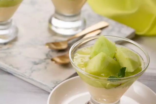 メロンのカスタードクリームパフェ。片栗粉をつかって作るカスタードクリームにぜいたくにメロンをのせたパフェです。