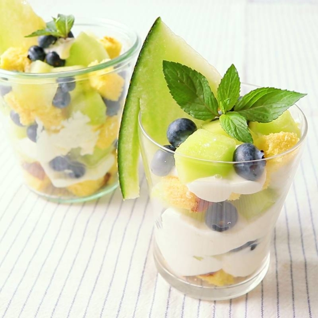 - グラスに、生クリーム、スポンジケーキ、小さめにカットしたメロンを交互に重ねていく。