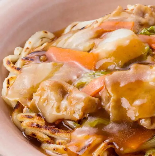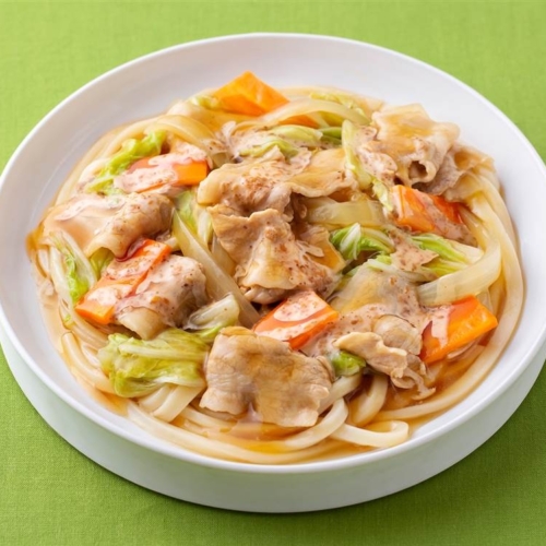 - とろみがついたら、焼いたうどんにかけて完成です。