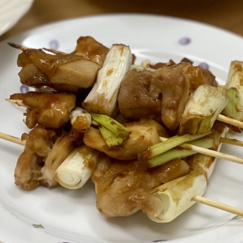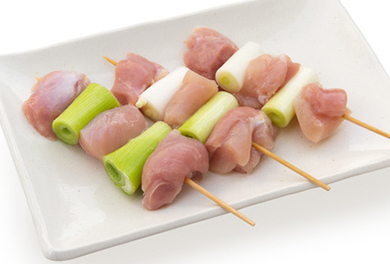 4. 竹串に、鶏肉・長ねぎの順に交互に刺し、焼き鳥のタレをからめます。