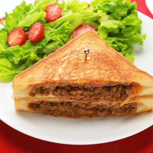 ホットサンドメーカーを使った簡単で美味しい、肉まんサンドのご紹介です。豚ひき肉とタマネギで肉まんの具を作ります。食パンにたっぷりと肉まんの具を入れてホットサンドメーカーで焼けば、アツアツの肉まんサンドの完成です。ぜひ、試してみてください。
