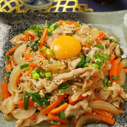 チャプチェとは朝鮮料理のひとつで、タンミョンという太めの春雨を、牛肉やタケノコ・タマネギなどの具材とともに、ごま油でいためて甘辛く味付けしたもの。