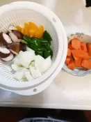 4. 別の耐熱容器に、玉ねぎ、人参、椎茸を入れレンジ600Wで3分加熱。