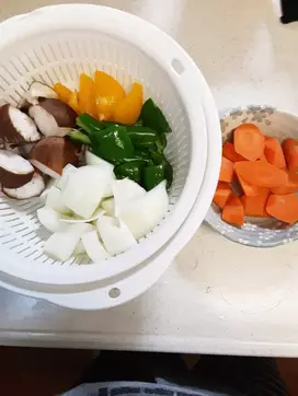 4. 別の耐熱容器に、玉ねぎ、人参、椎茸を入れレンジ600Wで3分加熱。