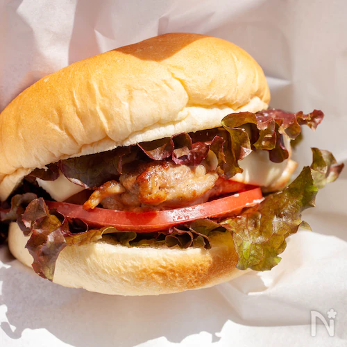 5. レタス、マヨネーズ、鶏肉、トマト、目玉焼きを挟んで完成です。