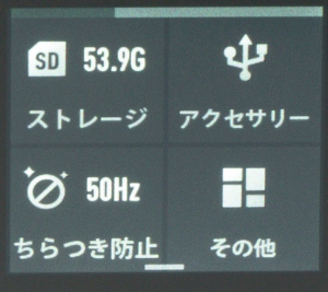 電源を入れると画面は動画の撮影状態で、動画モードの場合、モニター上部に解像度(1080P/30)とバッテリー充電状況、下部にSDカードの残容量が表示されています。